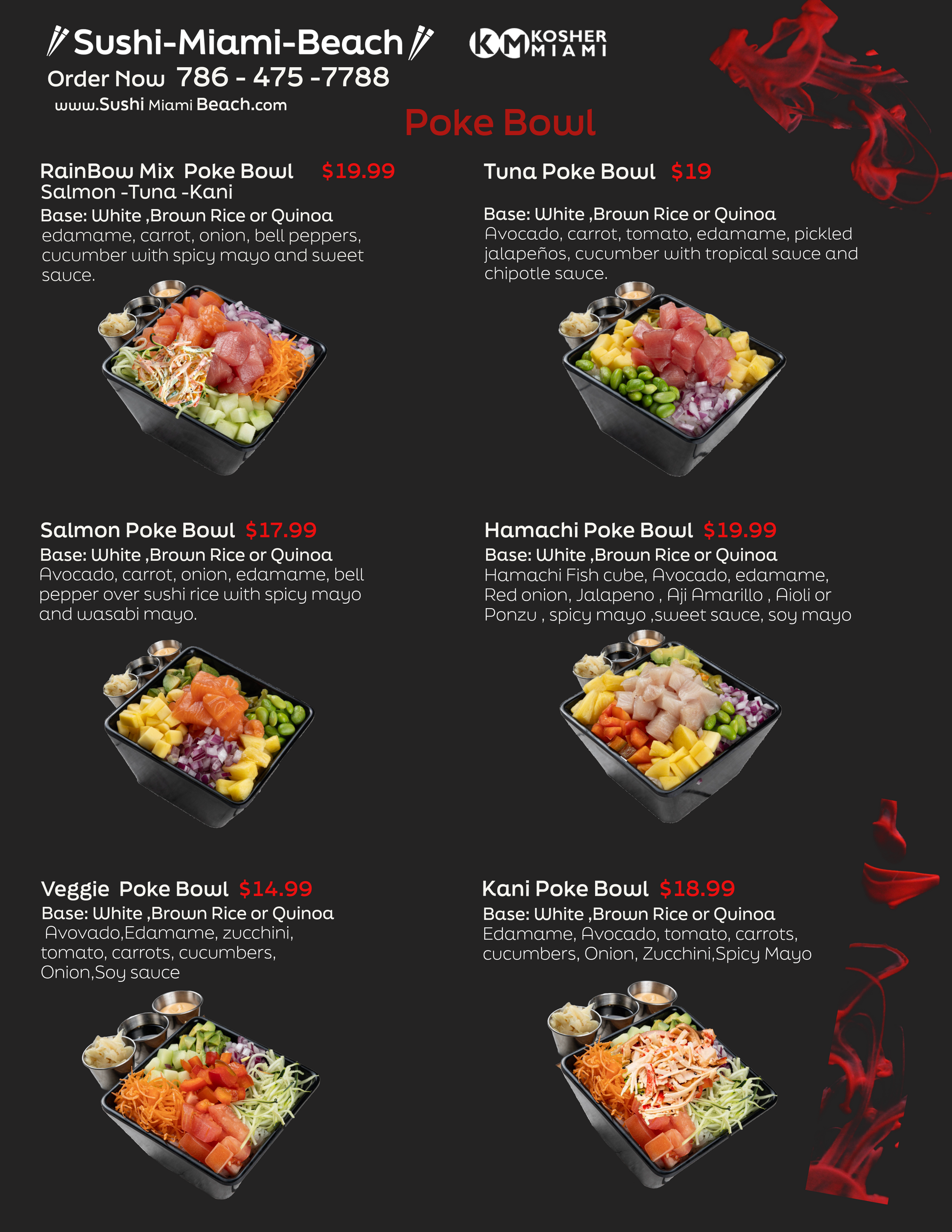 Embark on a culinary journey with our Hamachi Poke Bowl at Sushi Miami Beach, offering a choice of white rice, brown rice, or quinoa as a delightful base. Immerse your taste buds in the succulent flavors of Hamachi fish cubes, accompanied by creamy avocado, edamame, red onion, jalapeno, and the perfect blend of Aji Amarillo, Aioli, or Ponzu. 🍲🐟 Certified kosher by KM, this bowl is a symphony of freshness and bold tastes. Conveniently order online and experience the culinary magic of Miami Beach delivered to your doorstep. Elevate your dining with Hamachi Poke Sushi Bowl Miami, Order Online, Kosher, and Sushi Delivery. 🥢🚚 #HamachiPokeBowl #KosherMiamiBeach #SushiDelivery
